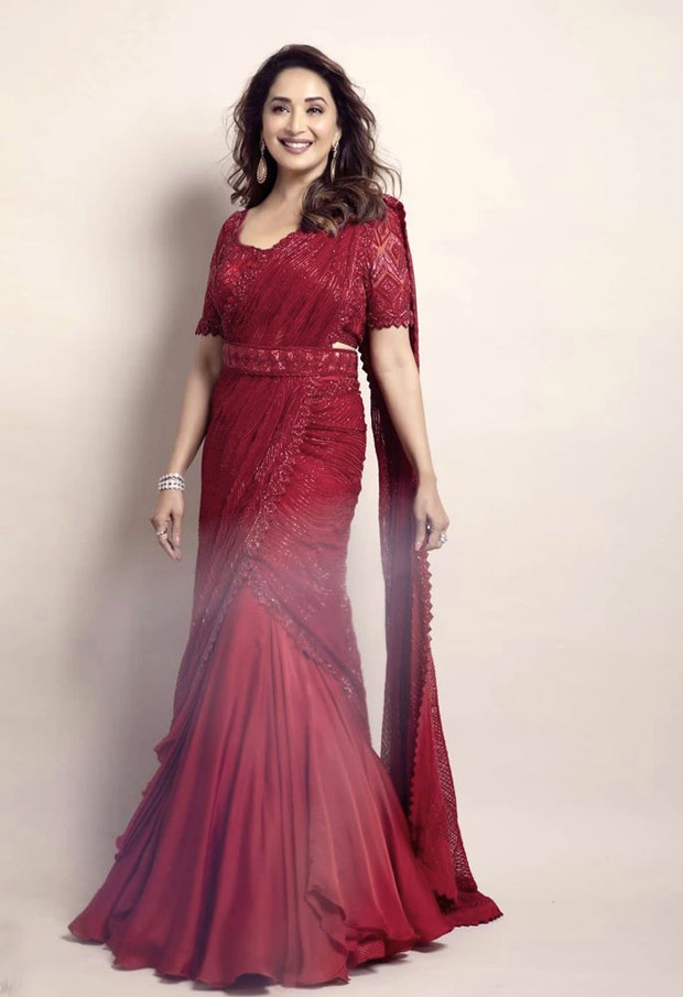 For Dance Deewane 3, she wore a super stunning warm red sequin saree that had beautiful work on the border; we all have eyes on her blouse that shows how amazingly the sequin diagonal work has been done. The belt, which was made from the same fabric, completed the ensemble; a silk skirt appeared from underneath the alternating detailing toward the front of the pre-stitched saree. The saree was from Ritika Mirchandani’s collection. She decided to go for absolutely glowing makeup with the perfect touch of highlighter and bronze, with warm nude lipstick! For her hair, she teamed up with decent waves! She added a diamond bracelet, rings and long beautiful earrings to complete the look! Her look is styled by Shaleena Nathani.